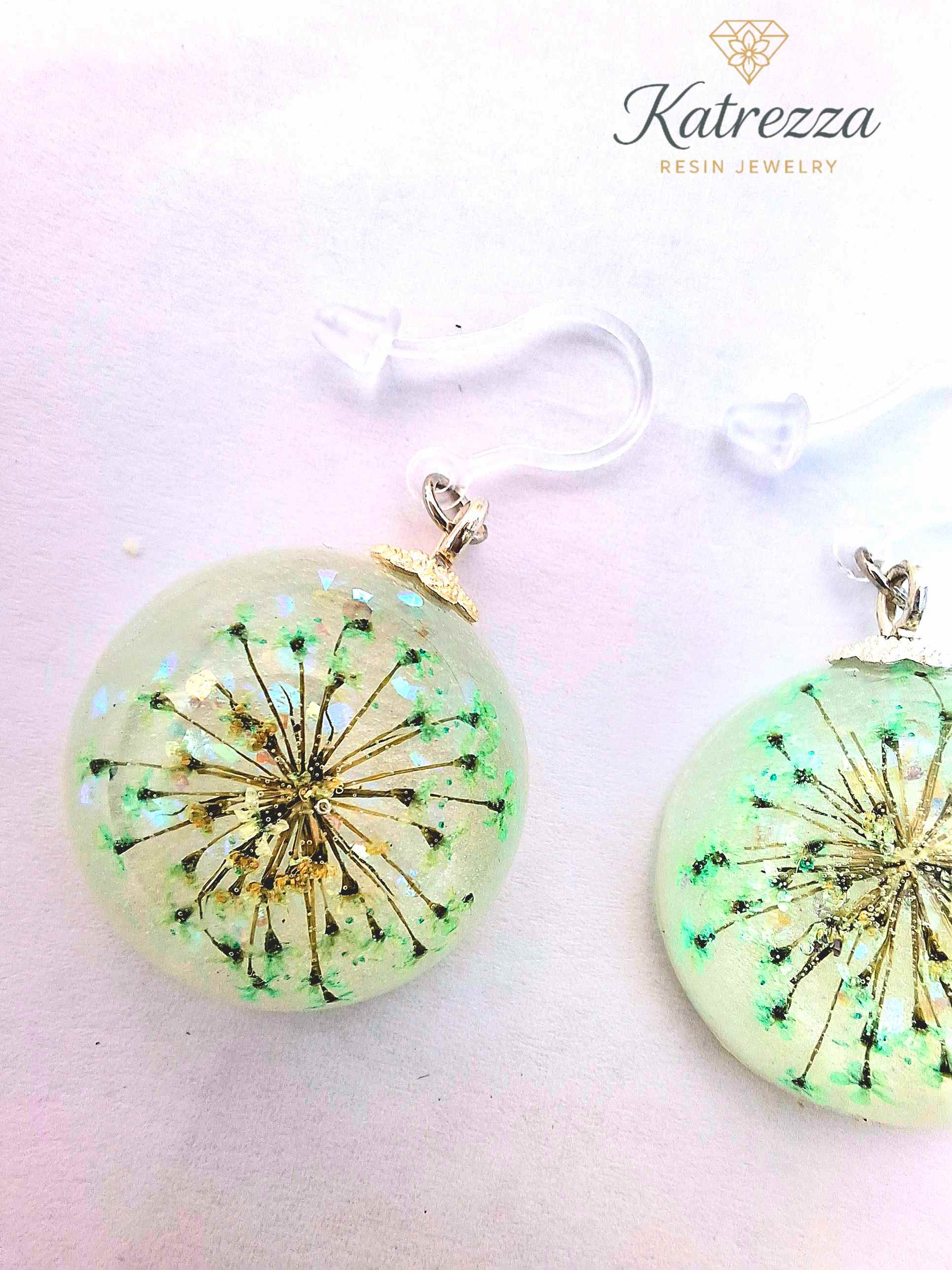 Elegant and nature-inspired, these handcrafted resin earrings feature delicate pressed flowers preserved in crystal-clear resin with subtle green accents and a touch of shimmer. Their round design and lightweight silicone hooks make them perfect for everyday wear or special occasions.