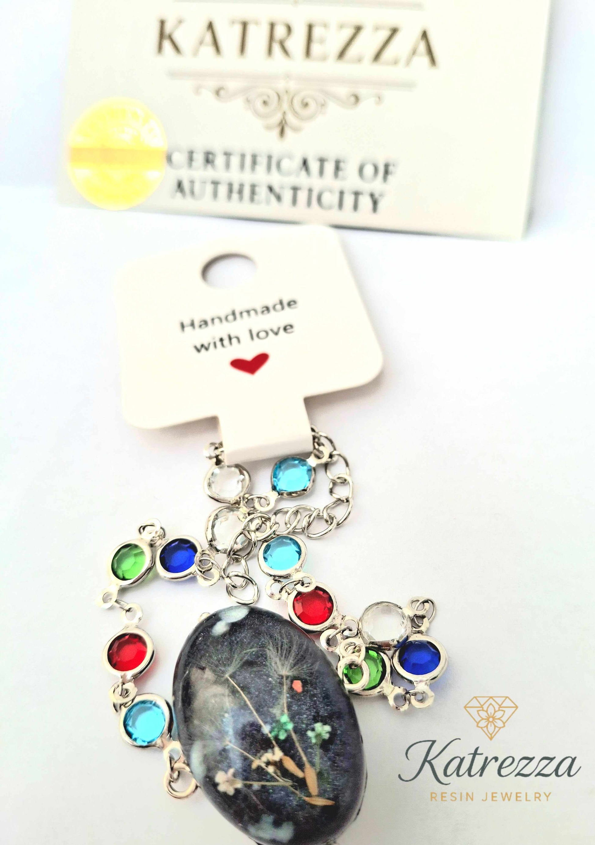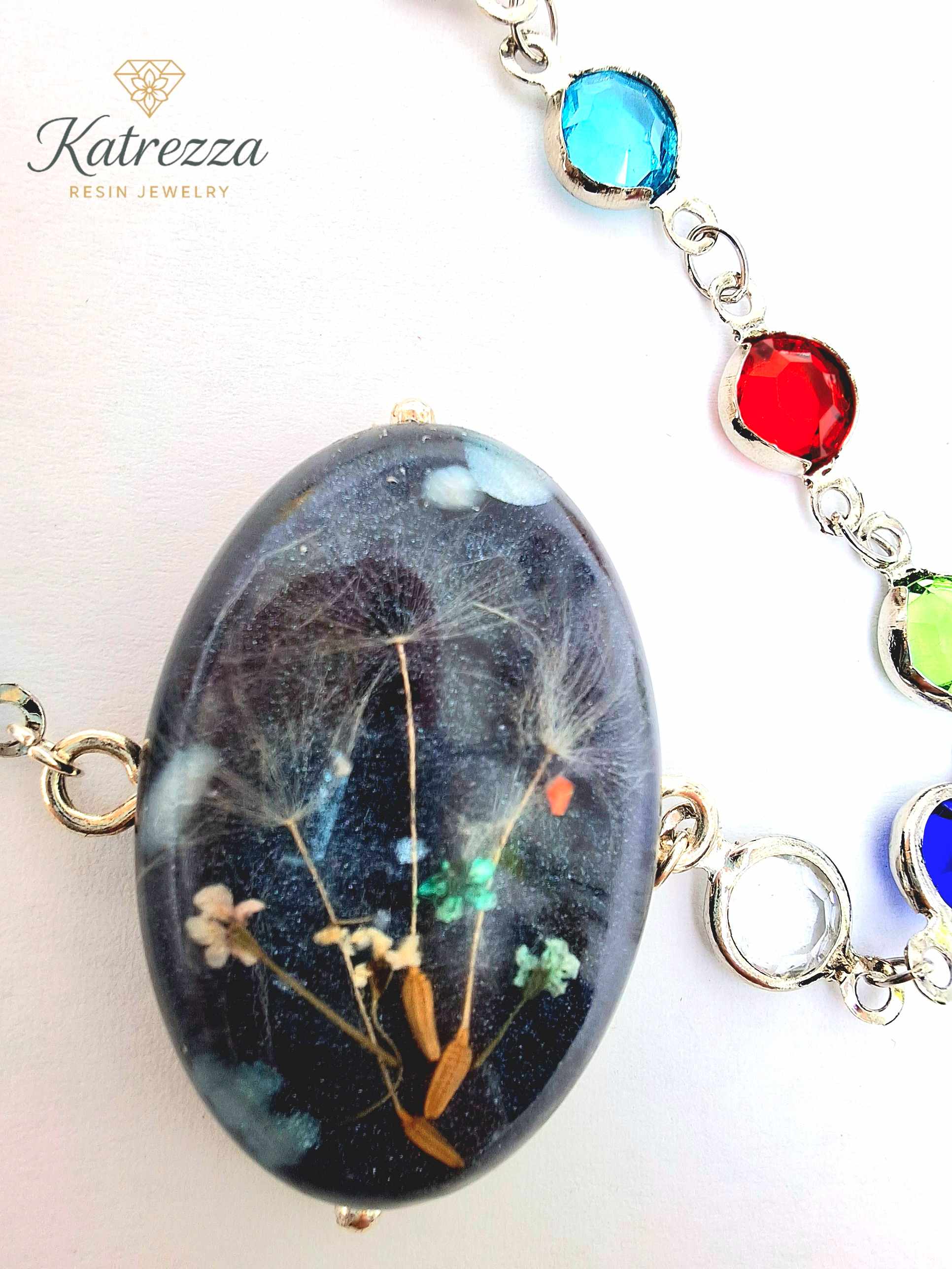 Delicate yet bold, the Midnight Dandelion Resin Bracelet captures the beauty of nature sealed in time. At its center lies a handcrafted oval resin cabochon with real dandelion seeds and tiny wildflowers, set against a deep night-sky background. The centerpiece is framed by a silvery stainless steel chain adorned with colorful gemstone-style links in red, blue, green, and clear.